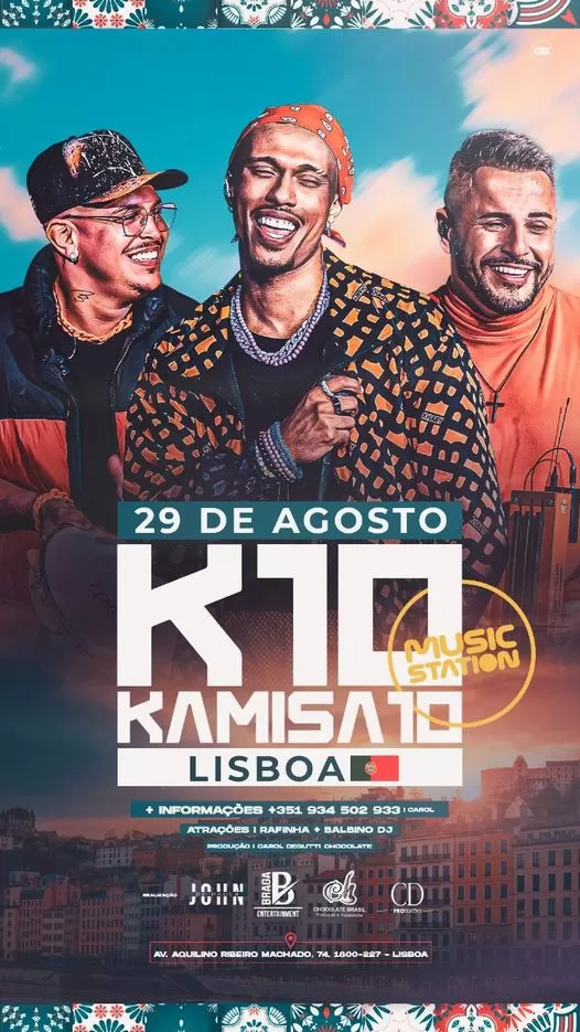 Kamisa10 – Music Station Pela primeira vez em Portugal, Kamisa10, trazem-nos o melhor do pagode brasileiro, já no dia 29 de Agosto, à Music Station. Grupo Kamisa 10 Bilhetes: https://www.eventbrite.nl/…/bilhetes-kamisa10-ao-vivo… Informações: 934502933 + Adicionar ao Google Calendar + iCal / Outlook export Tags: brasil Data 29 Ago 2024 Desde Hora 21:00 Localização Music Station Av. Aquilino Ribeiro Machado 74, 1800-227 Lisboa Categorias Concertos | Música Share this event Teatro Stand up Comedy Infantil Música Eventos Gratuitos Exposições Este Fim de semana