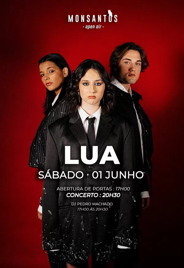 Descrição: LUA, uma das bandas mais promissoras do momento. Aurora Pinto, Catarina Vital e Jónatas Samuel são os nomes que se juntaram para dar início a esta nova promissora banda com o nome de “LUA”. Aurora, a mais nova, cedo se centrou nas canções, compôs a sua primeira música aos 10 anos e desde essa altura nunca mais parou. Vinda da longínqua cidade de Gouveia, com 11 anos participou no The Voice Kids, onde surpreendeu brilhando com uma canção da sua autoria. Catarina, roqueira desde sempre, é natural de Mem Martins, elegeu a guitarra como instrumento principal e desde muito cedo que dá espetáculos na rua e em bares! Jónatas toca bateria desde que se lembra, aos 6 anos começou a ter aulas de música na igreja em Mafra, de onde passou para o Ensino Profissional de Música, alargando progressivamente a sua arte a outros instrumentos. Jónatas, Catarina e Aurora Pinto: um conjunto improvável de jovens músicos/compositores que vão dar muito que falar. Fizeram uma participação especial com o tema “Sono” e têm 3 temas na série “Morangos com Açúcar”, a série mais vista e admirada pela juventude. No passado 9 de Fevereiro lançaram o primeiro álbum, composto por 10 temas, grande parte escrito e composto pela própria banda. Dia 1 de Junho apresentam-se em Lisboa no Monsantos Open Air.