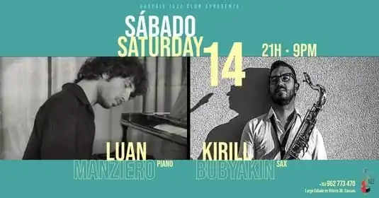Uma noite de jazz de qualidade no Cascais Jazz Club, com o talento de Luan Manziéro e Bubyakin Kirill! Não percas a oportunidade de ouvir performances únicas e envolventes.