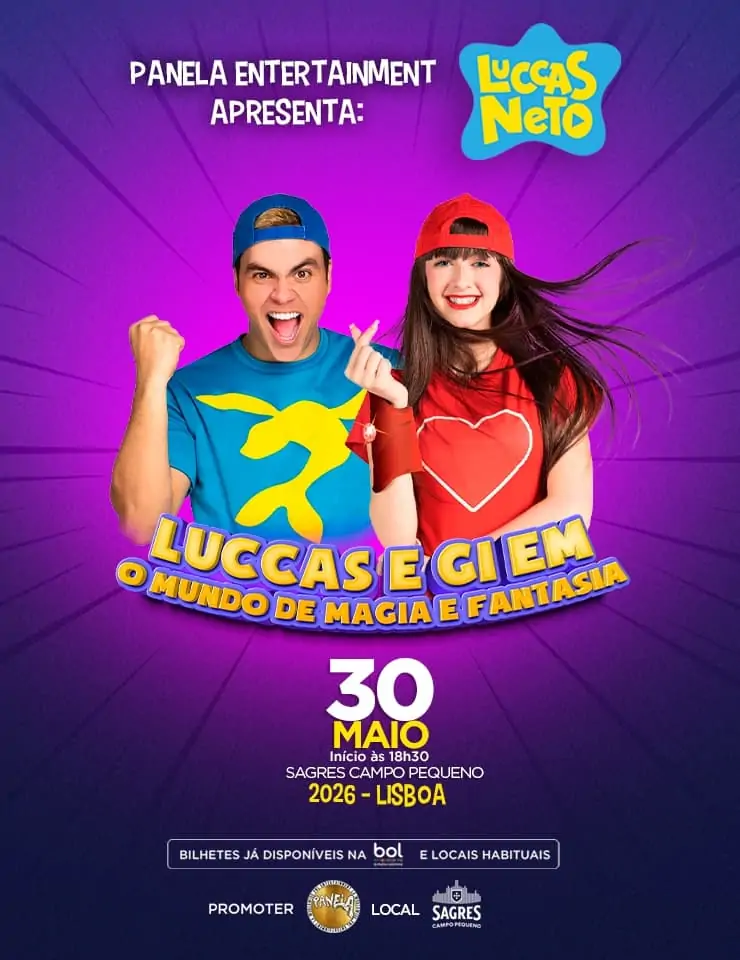 No dia 30 de maio de 2026, às 18h30, o Sagres Campo Pequeno, em Lisboa, recebe um espetáculo infantil imperdível com Luccas Neto e sua irmã Gi.