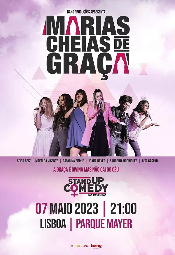 “Marias Cheias de Graça” um espectáculo de stand-up comedy 100% no feminino. A Comédia é uma arte de palco dominada por homens? Não é bem assim! Joana Neves, Catarina Pinkie, Sandrina Rodrigues, Mafalda Vicente, Rita Gaspar e Sofia Briz sobem ao palco e apresentam-se à sociedade com gargalhadas, pensamentos divertidos e uma mensagem importante!