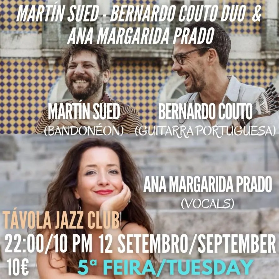 O Távola Jazz Club em Lisboa recebe uma noite especial com a dupla Martín Sued e Bernardo Couto, acompanhados pela talentosa Ana Margarida Prado. Este evento promete uma fusão única entre o bandoneón argentino, a guitarra portuguesa e a voz expressiva do fado, proporcionando uma experiência musical envolvente e inesquecível.