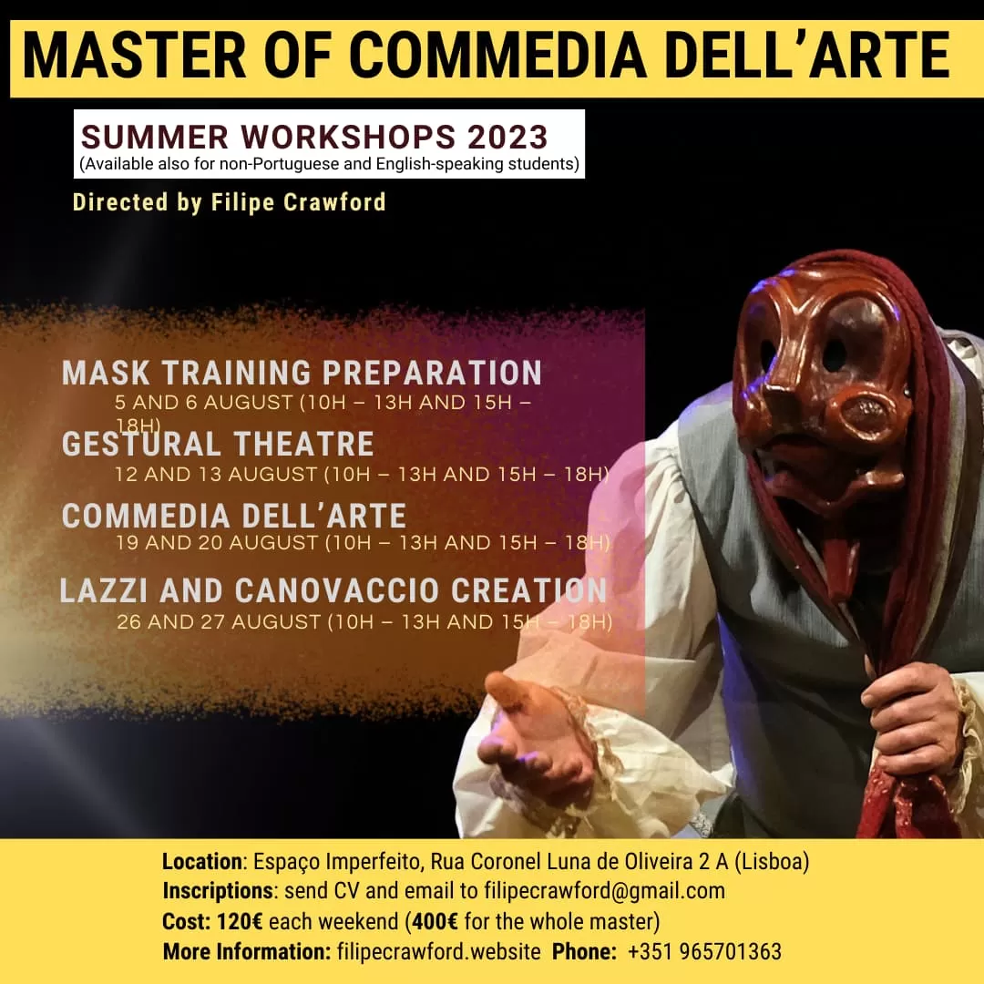 A Escola da Máscara promove, aos fins de semana, durante o mês de agosto de 2023, quatro Workshops intensivos de formação de atores através da Técnica da Máscara. Estes Workshops de aprendizagem progressiva configuram um Master de Commedia dell’Arte. A Commedia dell’Arte é um estilo de teatro com origem no renascimento italiano e também uma escola de aprendizagem da arte de representar considerada como uma formação fundamental para o ator dos nossos dias. Filipe Crawford introduziu a Técnica da Máscara em Portugal no final dos anos 80 e desde então tem formado centenas de atores nesta técnica especializada de representação teatral.