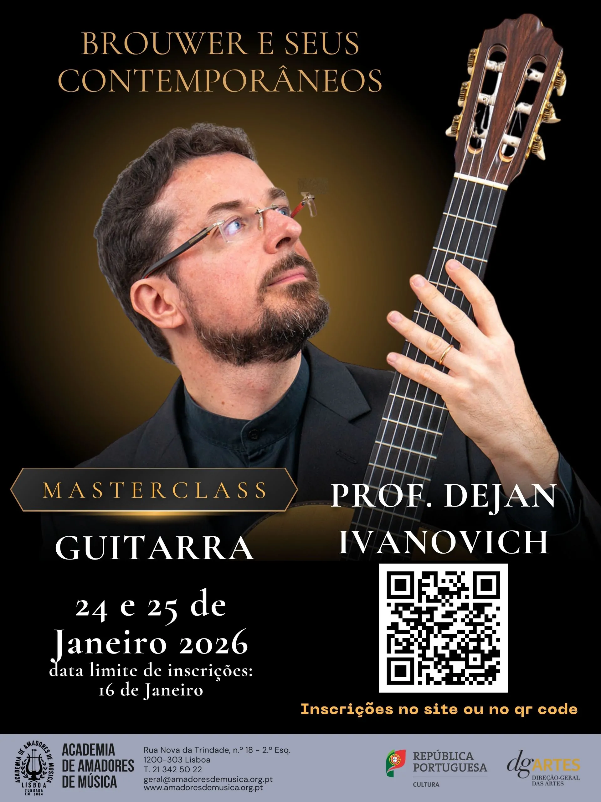 Inserida no Integral dos Estudos de Leo Brouwer, o Prof. Dejan Ivanovich seu contemporâneo, realiza na Academia de Amadores de Música uma Masterclass de Guitarra: uma oportunidade de aprendizagem singular para alunos de guitarra a partir do 3º grau.