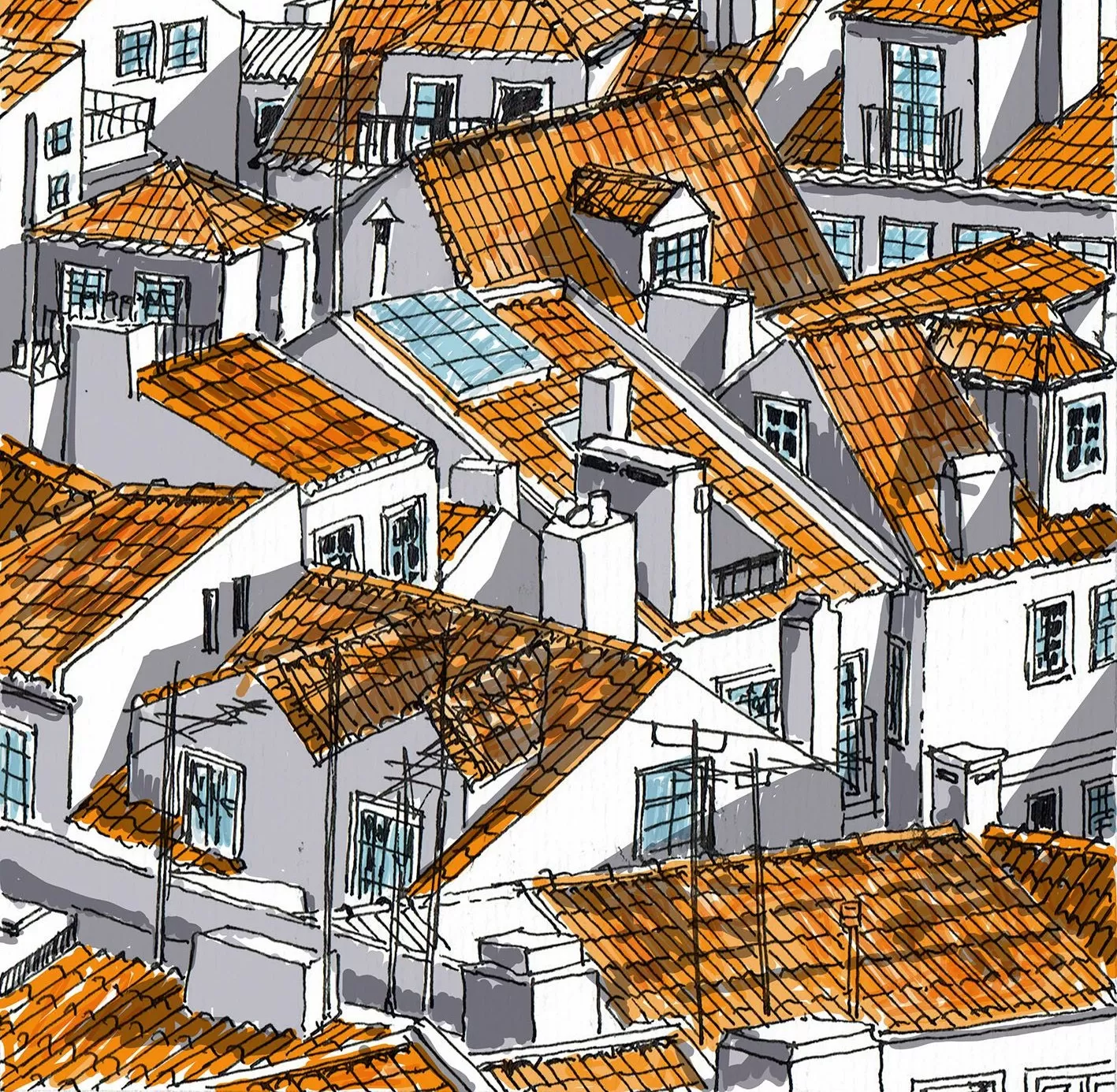 Entre aguarelas de casas típicas, onde o traço é o elemento principal, e obras de cariz abstrato, onde a mancha de cor ganha força, cruzam-se nesta exposição o passado, o presente e o futuro. Luís Jesus sempre se interessou pelo desenho de locais emblemáticos, no entanto é a primeira vez que trabalha estes conceitos de forma tão consciente. Através das técnicas e materiais que utiliza em conjunto, experimenta e transmite sensações distintas de elementos e memórias que lhe são familiares. Por um lado, a pintura em aguarela sobre desenhos a caneta, permite-lhe explorar esta proximidade, lembrando os tantos Sketchbooks que tem vindo a fazer. Por outro, as manchas de cor nos seus trabalhos abstratos possibilitam uma expansão de horizontes, uma procura por novos caminhos e relações entre grupos de cores.