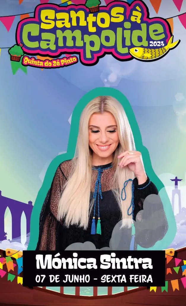 Mónica Sintra irá se apresentar no dia 7 de junho. Ela é uma cantora portuguesa conhecida por suas baladas românticas e músicas populares. Com uma carreira de sucesso que começou nos anos 90, Mónica Sintra conquistou o público com canções como “Afinal Havia Outra” e “Na Minha Cama Com Ela”.