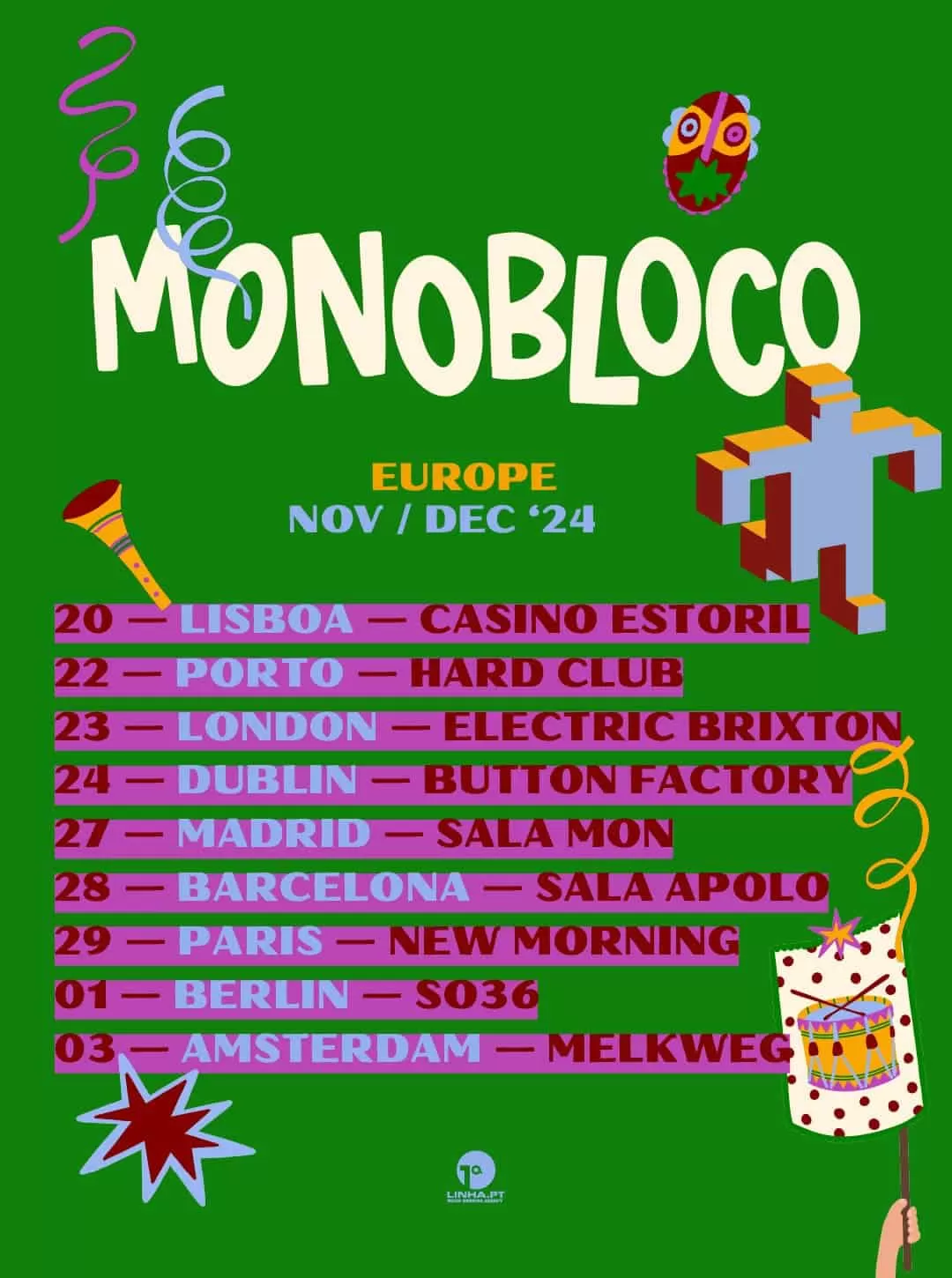 O coletivo brasileiro Monobloco estreia-se na Europa e em Portugal com sua primeira digressão europeia, promovida pela agência portuguesa Primeira Linha. Composta por nove batuqueiros e liderada pelos músicos Pedro Luis, João Biano, Celso Alvim, Pitito, C.A. Ferrari, Sidon Silva, Fabinho, Glauber Seixas, Robertinho e Mário Micco, a banda promete trazer o melhor do Brasil e sua batucada a sete países e nove cidades europeias.