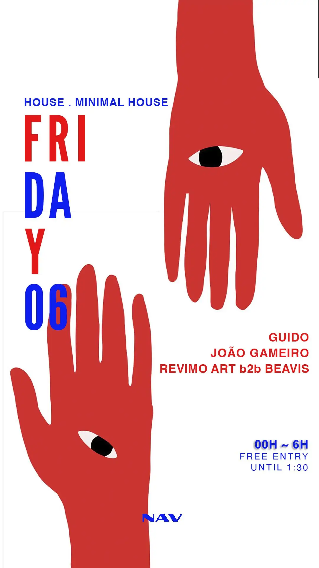 Esta sexta-feira, a NAV transforma-se no epicentro da house music! Com Guido, João Gameiro e o b2b de Revimo art e Beavis, a pista promete uma noite de energia e ritmos contagiantes. Traz os teus sapatos de dança e prepara-te para uma madrugada inesquecível com sons que te vão fazer mexer até de manhã.