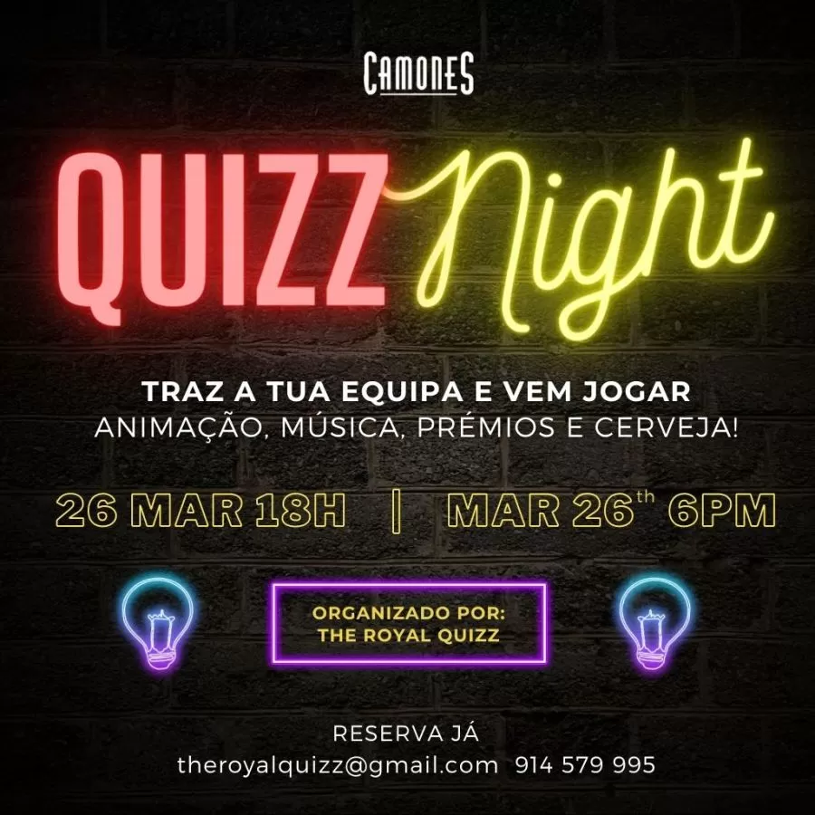 General culture, in Portuguese and English, with various topics such as cinema, music, sports, etc. Teams of three or four people. Entries are made by email: theroyalquizz@gmail.com or 914 579 995 The two teams with the most answers will definitely win a surprise prize 🏆