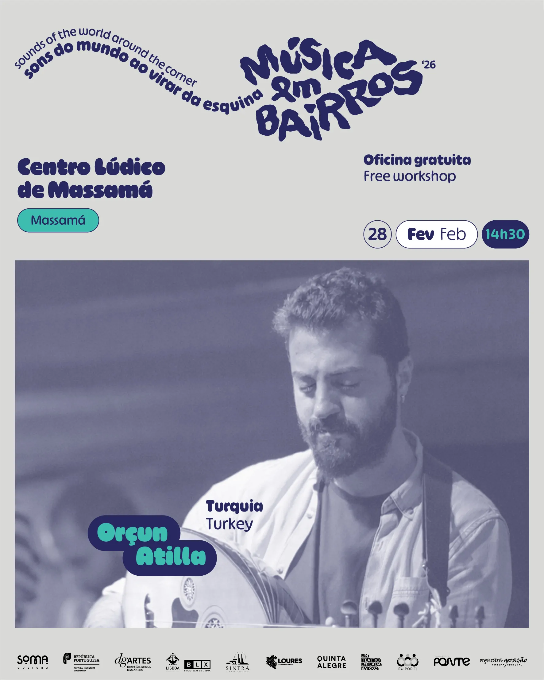 A oficina tem lugar às 14h30. No mesmo dia, às 16h30, Orçun Atilla apresenta-se também em concerto, com o percussionista @jordi.torrentsm . A entrada é igualmente livre (mediante reserva), sem restrições etárias.