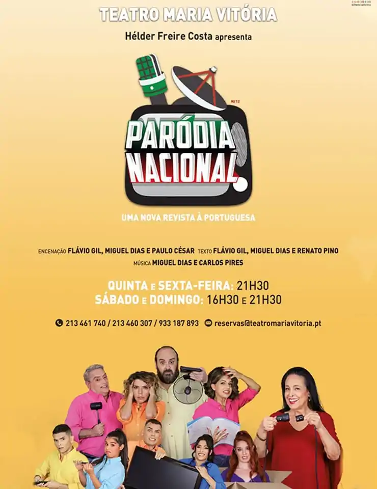 Com um elenco de nomes queridos do público português, onde se destacam Marina Albuquerque, a popular actriz televisiva que se estreia em Revista, Paulo Vasco, Miguel Dias e a extraordinária Cidália Moreira à frente de um grande elenco de actores, cantores e bailarinos, “PARÓDIA NACIONAL” promete encantar, divertir e surpreender o público. Uma Revista à Portuguesa inovadora, com produção de Hélder Freire Costa, encenação de Paulo César, texto de Flávio Gil, Miguel Dias e Renato Pino e música de Miguel Dias e Carlos Pires.
