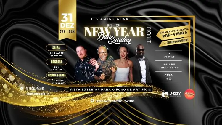 A DanSunday prepara uma das celebrações de Passagem de Ano mais intensas e vibrantes de Lisboa, reunindo dança, música, animação e uma vista privilegiada para o fogo de artifício. A festa acontece no Jazzy Dance Studios – Santos, no dia 31 de dezembro de 2025, entre as 22h00 e as 04h00, num ambiente pensado para quem quer começar 2026 com energia, ritmo e muita alegria.