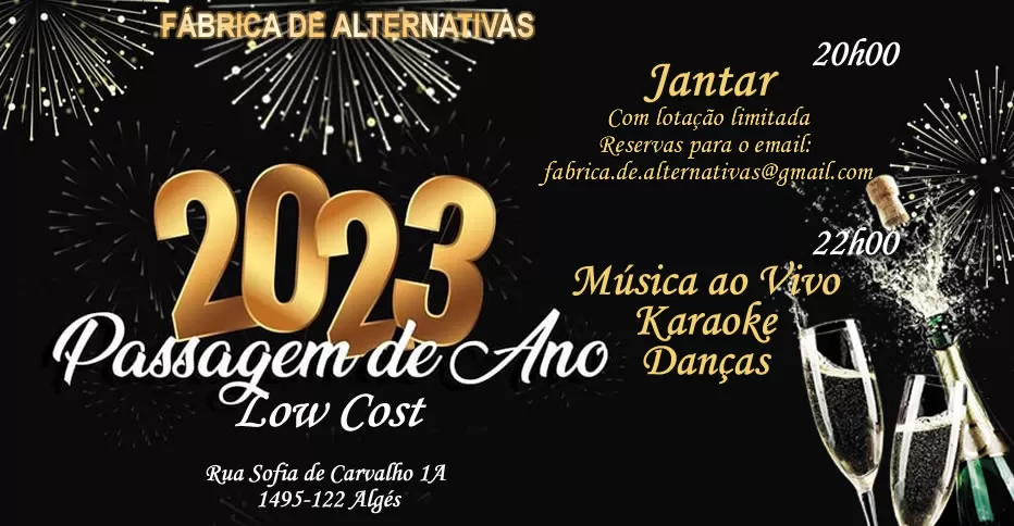 Mais um ano que vai acabar e outro novo em folha para estrear. A Fábrica de Alternativas vai estar aberta para celebrar mais esse momento. Para isso faremos um jantar “Low Cost” para quem desejar participar. Será às 20 horas e o preço será de 12 Euros (bebidas à parte). A partir das 23 horas a porta estará aberta para oyros que se queiram juntar a nós. Haverá música ao vivo, danças e alegria.