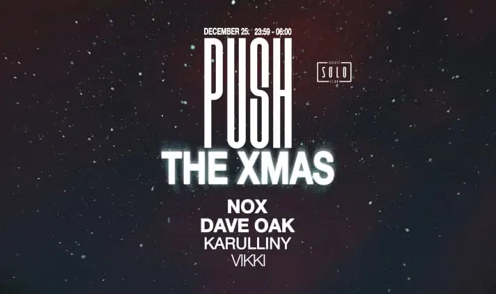 O PUSH prepara uma despedida de ano em grande estilo! E nada melhor do que celebrá-la no dia mais mágico do ano, 25 de dezembro. Junte-se aos amigos e celebre o Natal com música de alta energia no SOLO Club em Cascais. A noite contará com os DJs NOX (Fuse Records), Dave Oak, Karulliny e a estreia de Vikki na cabine!