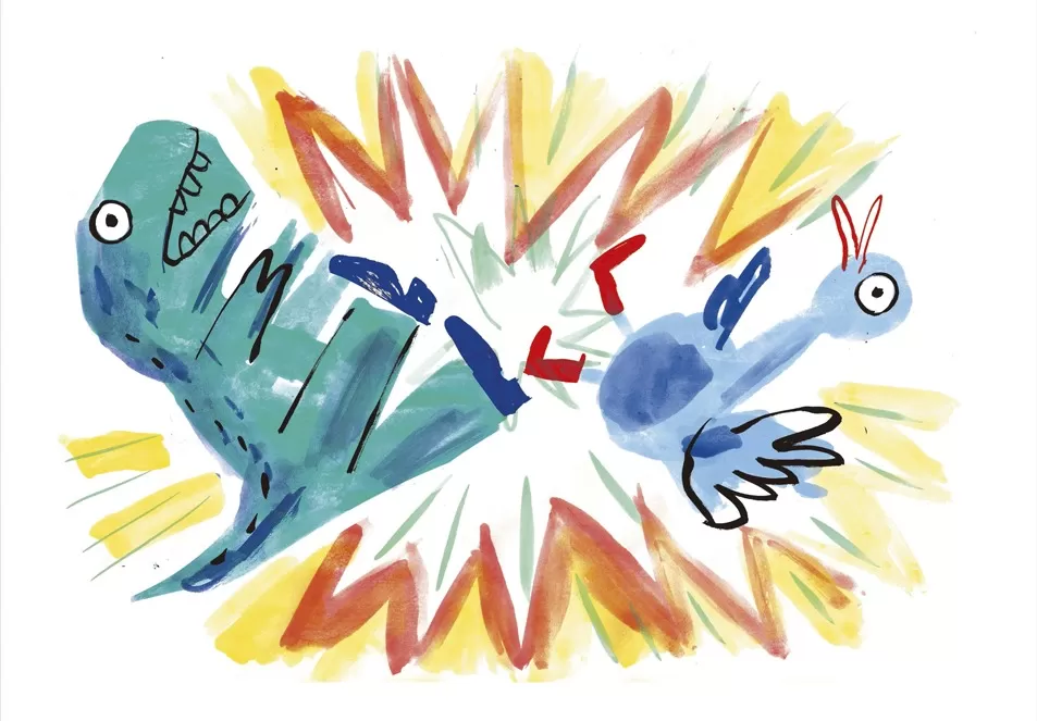 Numa manhã de um dia igual a tantos outros, o Pato Elias e o Dinossauro Rex correm pela rua por razões diferentes: o Pato está atrasado e o Dinossauro persegue um coelho para o assustar. Correm tão rápido que não dão um pelo outro e chocam numa esquina, com grande estrondo. Ninguém se magoa e seguem as suas vidas, mas depois desse choque, tudo nesse dia vai ser diferente. Ambos vão descobrir que afinal as coisas não são sempre como parecem e como às vezes é preciso mudar de lugar para perceber melhor o que nos rodeia. E também que certos problemas se resolvem cantando a uma só voz.