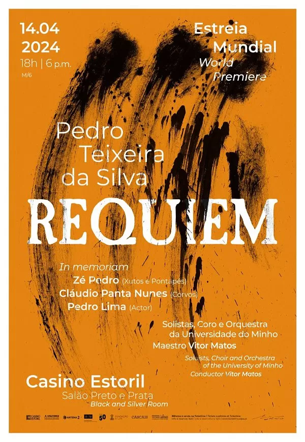 Num inesquecível evento que promete emocionar os sentidos, apresentamos em Estreia Mundial “Requiem”, obra original escrita pelo compositor Pedro Teixeira da Silva, é uma experiência única e comovente que une música e talento excecional numa homenagem dedicada à memória de três artistas da cultura portuguesa: Zé Pedro (Xutos e Pontapés), Cláudio Panta Nunes (Corvos) e Pedro Lima (Ator).