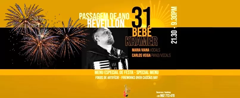 O CASCAIS JAZZ CLUB tem o prazer de anunciar sua festa de fim de ano que acontecerá no dia 31 de Dezembro, a partir das 21.30h, na sede no Club, no Lg Cidade de Vitória 36. O evento contará com o mundialmente reconhecido e talentoso Bebê Kramer, que apresentará uma seleção refinada de sucessos da música brasileira, do jazz e do fusion, interpretados com maestria e paixão, incluindo criações originais que demonstram a sua genialidade e criatividade. Além disso, haverá uma participação especial da cantora Maria Viana e do pianista Carlos Veiga. O local possui capacidade para 36 lugares e o donativo pedido será de €85 (com jantar/ ceia incluído) e de €50 (apenas apresentação musical).