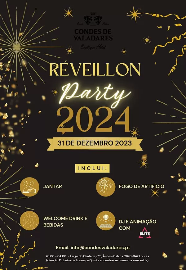 Trata-se de uma festa final de ano, composto por um jantar memorável: amuse-bouche, 2 entradas, prato de peixe, tira sabores, prato de carne e uma fantástica sobremesa! Iremos brindar com um deslumbrante fogo de artificio e saborear a nossa ceia buffet!!Iremos ter a companhia de uma excelente animação durante a festa toda. Venha se divertir!Venha celebrar o Réveillon na Quinta que conta histórias!Garanta o seu lugar até ao dia 18 de dezembro e entre em 2024 com uma história para contar
