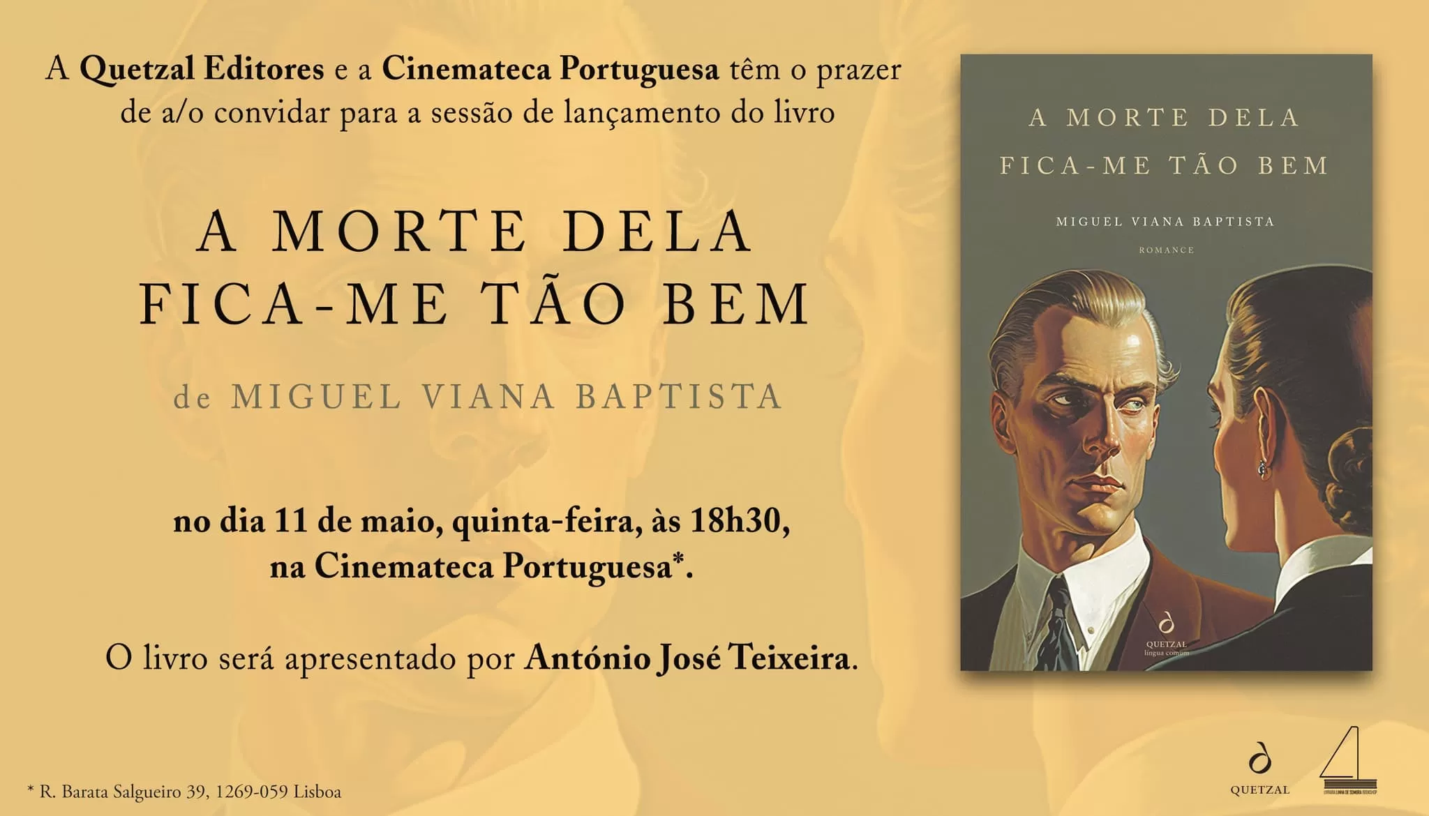 A Quetzal Editores e a Cinemateca Portuguesa têm o prazer de a/o convidar para a sessão de lançamento do livro A Morte Dela Fica-me Tão Bem, de Miguel Viana Baptista, que decorre na quinta-feira, 11 de maio, às 18h30, na Cinemateca Portuguesa, em Lisboa. O livro será apresentado por António José Teixeira.
