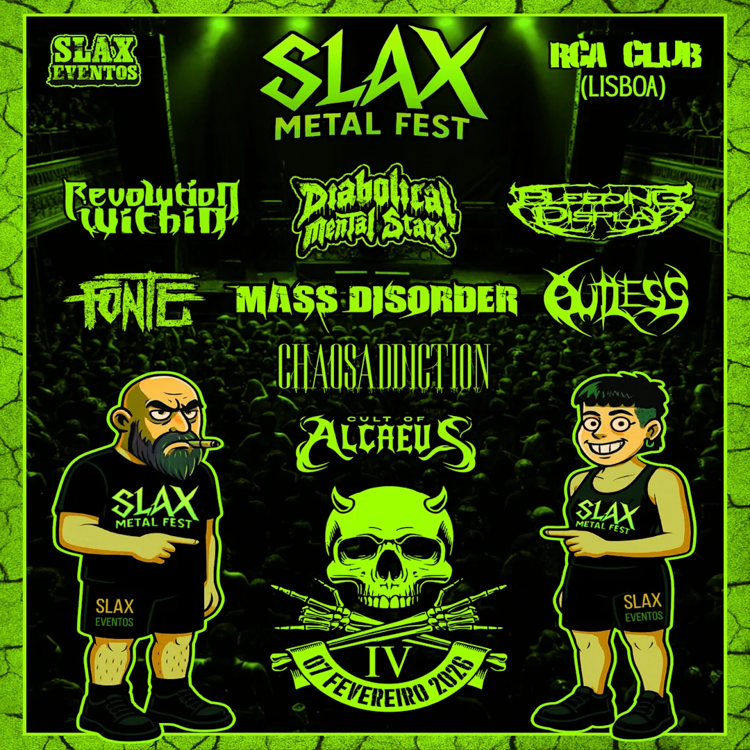 SLAX METAL FEST Line-up Demolidor Noite de Puro Thrash & Death Metal nacional! Revolution Within Diabolical Mental State Bleeding Display Fonte MASS DISORDER Outless chaosaddiction CULT OF ALCAEUS Pré-Vendas: slaxeventos.pt | rcaclub.com Entrada: 20€ (Oferta do copo + 1 bebida ligeira incluida) TU NO MOSH PIT? ATREVES-TE! Apoia o Underground Nacional! Segue @slaxeventos para mais informações! + Adicionar ao Google Calendar + iCal / Outlook export Data 07 Fev 2026 Hora 16:00 - 23:55 Localização RCA Club - LIsboa R. João Saraiva 18, 1700-249 Lisboa Website https://cartazculturallisboa.pt/agenda-rca-club-lisboa/ Categorias Concertos | MúsicaEventos ao Fim de SemanaFestivais Share this event Teatro Stand up Comedy Infantil Música Eventos Gratuitos Exposições Este Fim de semana