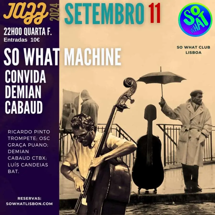 Descrição: O So What Club Lisboa convida para mais uma noite de jazz com a banda da casa, So What Machine, e o contrabaixista convidado especial, Demian Cabaud. Este evento promete transformar as quartas-feiras em momentos icônicos para os amantes de jazz em Lisboa. A noite contará com uma jam session, onde músicos convidados se juntarão à banda para uma segunda parte improvisada.