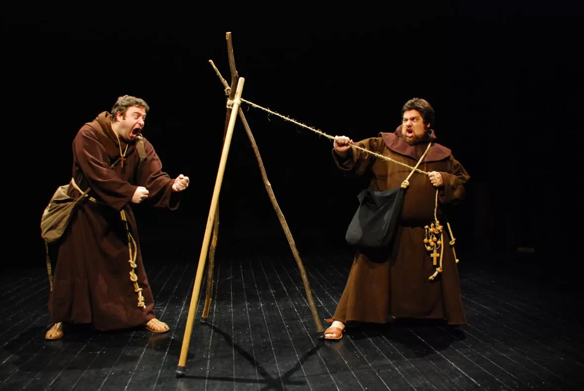 Esta encenação junta uma dupla de atores para dar corpo a dois frades que, com muita animação e interação com o público, aproveitam para relatar passagens divertidas da vida do seu mentor – Francisco de Assis –, a partir do conto popular Sopa da Pedra. Para isso, constroem marionetas à vista de todos com materiais e objetos inusitados, divertindo o público de todas as idades.