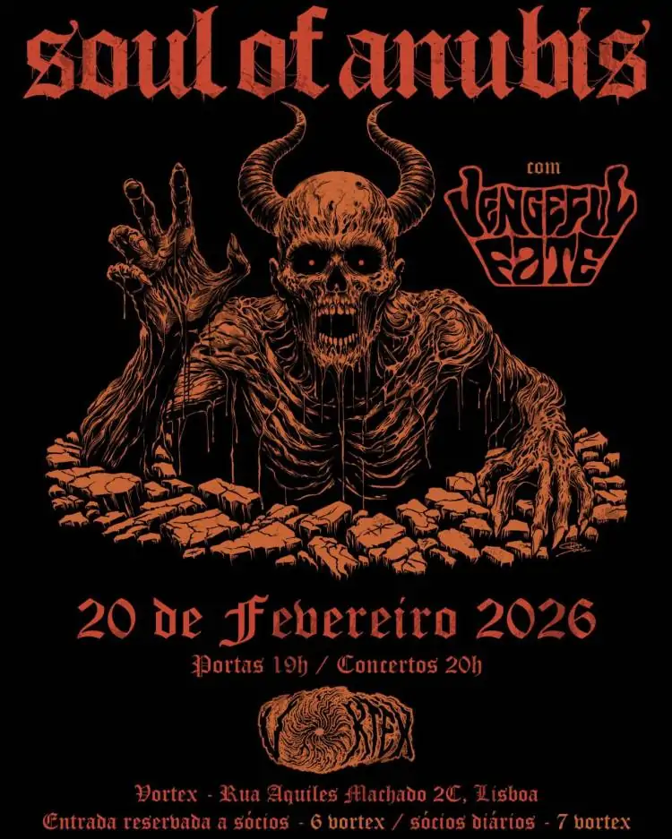 Lisboa recebe uma noite intensa de metal extremo com o RITUAL RELEASE SHOW no Vortex, apresentando Soul of Anubis e Vengeful Fate. Este concerto marca o lançamento do novo álbum RITUAL da banda portuguesa Soul of Anubis, prometendo expandir os limites do metal com riffs poderosos, groove sombrio e peso emocional.