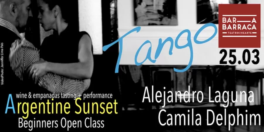 🇱🇷 SPRING IS COMING! Come and enjoy an ‘Argentinian Sunset’ at the iconic Bar d’A Barraca! Invite your friends for a memorable experience in an Art Deco environment of rare beauty.. Everything will start with a tasting of empanadas and Argentine wine that will be accompanied by the unmistakable sound of tangos from the 40s. After this first moment, we will have a tango initiation class and a surprising exhibition by professional dancers Camila Delphim and Alejandro Laguna that will surprise you… Both will guide you through the first movements and embraces of this sensual dance that was born on the outskirts of the ‘end of the world’ in the last two decades of the 19th century. Alejandro is a Tango teacher and dancer, researcher (PhD) in performing arts, born in Buenos Aires City🇦🇷. Camila is a talented dancer born in Barra Mansa in Rio de Janeiro🇧🇷. She started dancing at the age of 7. She is a tango and brazilian couple dances teacher and was the first Brazilian dancer to reach the final of the tango world championship in Buenos Aires (2017). Instagram @delphim_laguna “If you like to embrace and be embraced, Argentina and its Tango are for you!” ℹ️ Please read the information about the Sunset until the end.. WHEN? Saturday, March 25th HOURS🕔? The event starts 5.00p.m. with tasting and talk with friends, meet new people | 5:30 experimental tango class | 6:20 Performance Alejandro Laguna and Camila Delphim | 7:00 end. On this day the sunset is scheduled for 6:52p.m.! WHERE? Teatro Cinearte, Largo de Santos, 2. 1200-808 Lisboa (in front of Jardim de Santos). HOW TO TAKE PART? Send your request to milongabarraca@gmail.com. We accept two reservations per person. For example, I request a reservation for João, or for Pedro and Ana, Susana and Margarida, Filipe and Paulo. The reservation will be effective after you receive our confirmation. The last day we take reservations is March 23. HOW MUCH? Suggested contribution of €15 to support the artists (we don’t have an ATM so we ask you to bring cash). 🛎 IMPORTANT❗️ If you have to cancel your reservation, please let us know at least 24 hours in advance so that we can accept people who are on the waiting list. 🇵🇹 A PRIMAVERA ESTÁ A CHEGAR! Vamos desfrutar um ‘Entardecer Argentino’ no icónico Bar d’A Barraca! Convida os teus amigos e amigas para uma experiência memorável num ambiente Art Decó de rara beleza.. Tudo vai começar com uma degustação de empanadas e vinho Argentino que serão acompanhados pela inconfundível sonoridade dos tangos dos anos 40. Após este primeiro momento, vamos ter uma aula de iniciação ao tango e uma exibição dos bailarinos Camila Delphim e Alejandro Laguna que vos irá a surpreender.. Ambos irão guiar-vos nos primeiros movimentos e abraços desta dança sensual que nasceu nos arrabaldes do ‘fim do mundo’ nas últimas duas décadas do s.XIX. Alejandro é professor e bailarino de Tango, investigador (PhD) em artes performativas nascido em Buenos Aires🇦🇷. Camila é uma talentosa bailarina nascida em Barra Mansa no Rio de Janeiro🇧🇷. Ela iniciou-se na dança aos 7 anos. É professora de danças a par e foi primeira bailarina brasileira em chegar à final do campeonato mundial de tango em Buenos Aires (2017). “Se gostas de abraçar e ser abraçado, a Argentina e o seu Tango são para ti!” ℹ️ Por favor leiam as informações do evento até o fim.. QUANDO? Sábado, 25 de Março HORAS? O evento começa às 17h00 com degustação e convívio com amigos, com novas pessoas | 17h30 aula experimental de tango | 18h20 performance de Alejandro Laguna e Camila Delphim | 19h00 Fim. Neste dia o pôr do sol é previsto para as 18h52! ONDE? Teatro Cinearte, Largo de Santos, 2. 1200-808 Lisboa (em frente ao jardim de Santos). COMO PARTICIPAR: Envia-nos o teu pedido de reserva para milongabarraca@gmail.com Aceitamos até duas reservas por pessoa. Por exemplo, solicito reserva para João, ou para Pedro e Ana, Susana e Margarida, Filipe e Paulo. A reserva ficará efetiva após receberes a nossa confirmação. O último dia em que aceitamos reservas é 23 de março. QUANTO? Contribuição sugerida de 15€ para o apoio dos artistas (não temos multibanco por isso pedimos-te para trazer cash). 🛎IMPORTANTE❗️ Caso tenhas que cancelar a tua reserva agradecemos que nos avisem até 24 hs antes de modo a podermos aceitar pessoas que se encontrem em lista de espera.