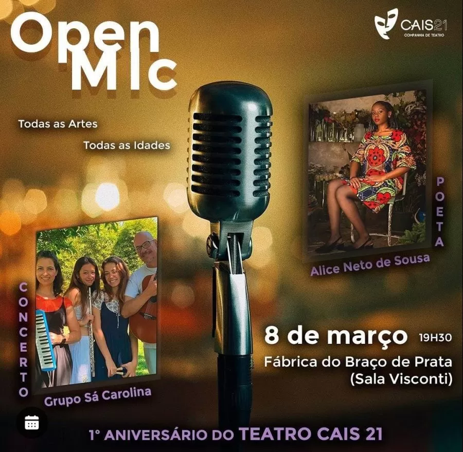 OPEN MIC | Aniversário Teatro Cais 21 É com enorme prazer que anunciamos o nosso primeiro Sarau Open Mic! 🗓️ Dia 8 de março | a partir das 19h30 📍Fábrica Braço de Prata (Sala Visconti). Como convidados, contaremos com as poesias da Poeta Alice Neto de Sousa @alicensousa (📷 André Ferreiro) e com o concerto do Grupo Sá Carolina! 🔥 Quem se quiser aventurar no Open Mic e subir a palco, as inscrições serão feitas na hora. Uma noite cheia de emoções, surpresas e artes! PS: ainda terás direito a uma fatia de bolo
