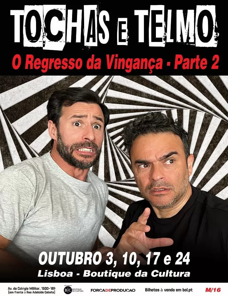 Prepara-te para o regresso triunfal de “Tochas e Telmo”! Após uma breve pausa para permitir ao público descansar da loucura dos espetáculos anteriores, os imparáveis Pedro Tochas e Telmo Ramalho estão de volta, e desta vez, com sede de vingança! Com uma eletrizante química em palco e muita boa disposição, tornam cada momento divertido e inesquecível. Mestres na arte da comédia desconcertante, esta dupla não tem medo de fazer figuras tristes para entreter o seu público. Não percas a parte dois deste explosivo espetáculo de comédia, que não teve uma parte um.