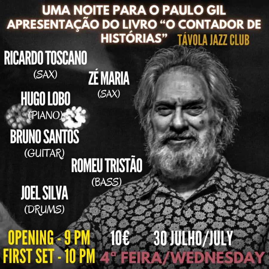 No dia 30 de julho de 2025, das 22h00 às 00h00, o Távola Jazz Club, em Lisboa, acolhe uma homenagem especial ao poeta Paulo Gil com a apresentação do livro “O Contador de Histórias” acompanhada de um concerto de jazz ao vivo, reunindo alguns dos maiores nomes da cena jazz portuguesa.