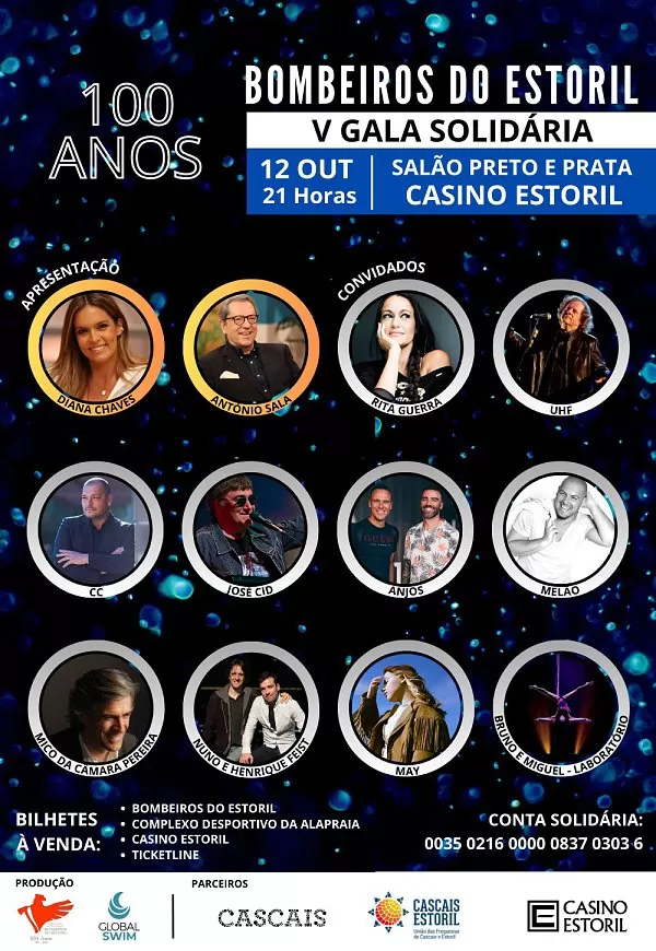 A Associação Humanitária de Bombeiros dos Estoris em comemoração dos 100º Aniversário organiza a V Gala Solidária dos Bombeiros do Estoril, a realizar no dia 12 de Outubro, quinta-feira, pelas 21horas no Salão Preto e Prata no Casino Estoril.