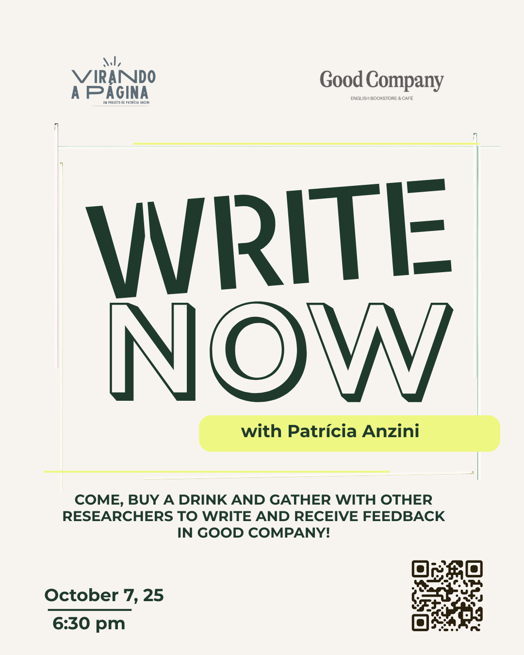 O Write Now é um encontro mensal aconchegante para pesquisadores, académicos e escritores de todos os tipos se reunirem, tomarem uma bebida, escreverem e se conectarem. Seja para trabalhar em um artigo, tese, manuscrito ou apenas fazer um brainstorm, este é o teu espaço para: