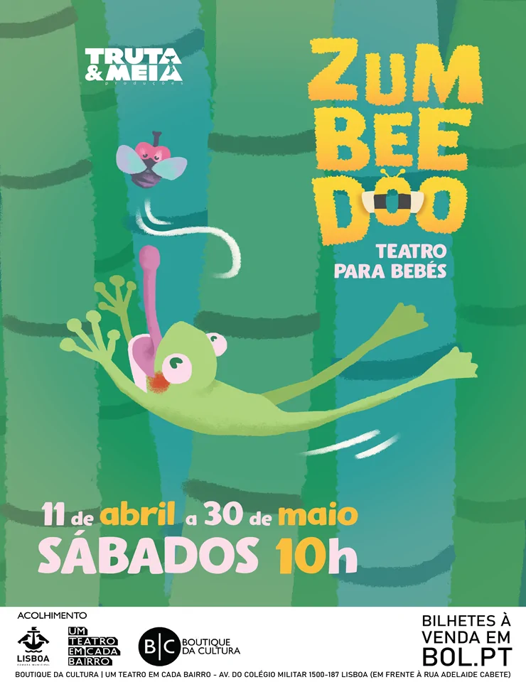 Zum Bee Doo, espetáculo sensorial para a primeira infância, está em cena de 11 de abril a 30 de maio de 2026 na Sala Preta da Boutique da Cultura (Carnide, Lisboa), com sessões matinais como 11 abr 2026, 10h00 (duração 35 min sem intervalo). Criação da Truta&Meia Produções (especializada em teatro musical infantil e aulas canto), usa cores, sons e imagens da floresta/pântano para bebés descobrirem animais, árvores, flores e frutos, com música suave e metáfora do botão‑flor para o desenvolvimento infantil.